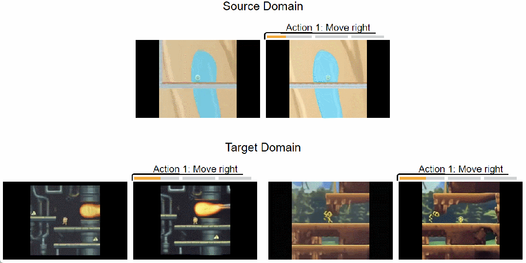 虽然一些动作及其相应的运动模式只出现在一些模拟数据中,但 Pandora 可以将动作可控性迁移到不同的未见领域。如下图所示图,Pandora 分别将 Coinrun 的 2D 游戏能力和 HM3D 的 3D 模拟器能力迁移到其他未见领域。