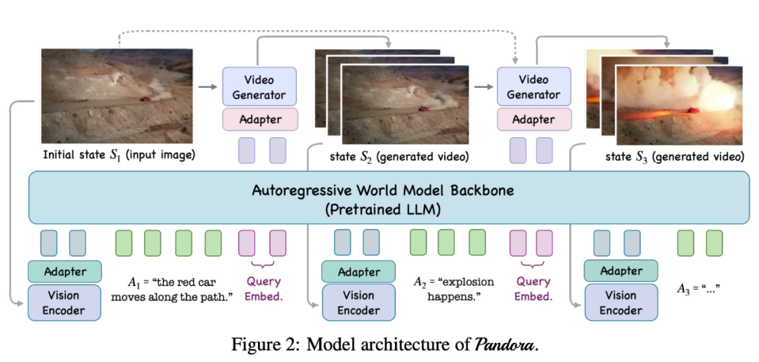Pandora 是一个自回归世界模型。给定世界先前的状态(例如图像或视频剪辑)和自然语言动作描述,它可以预测世界的下一个状态(以视频剪辑的形式)。