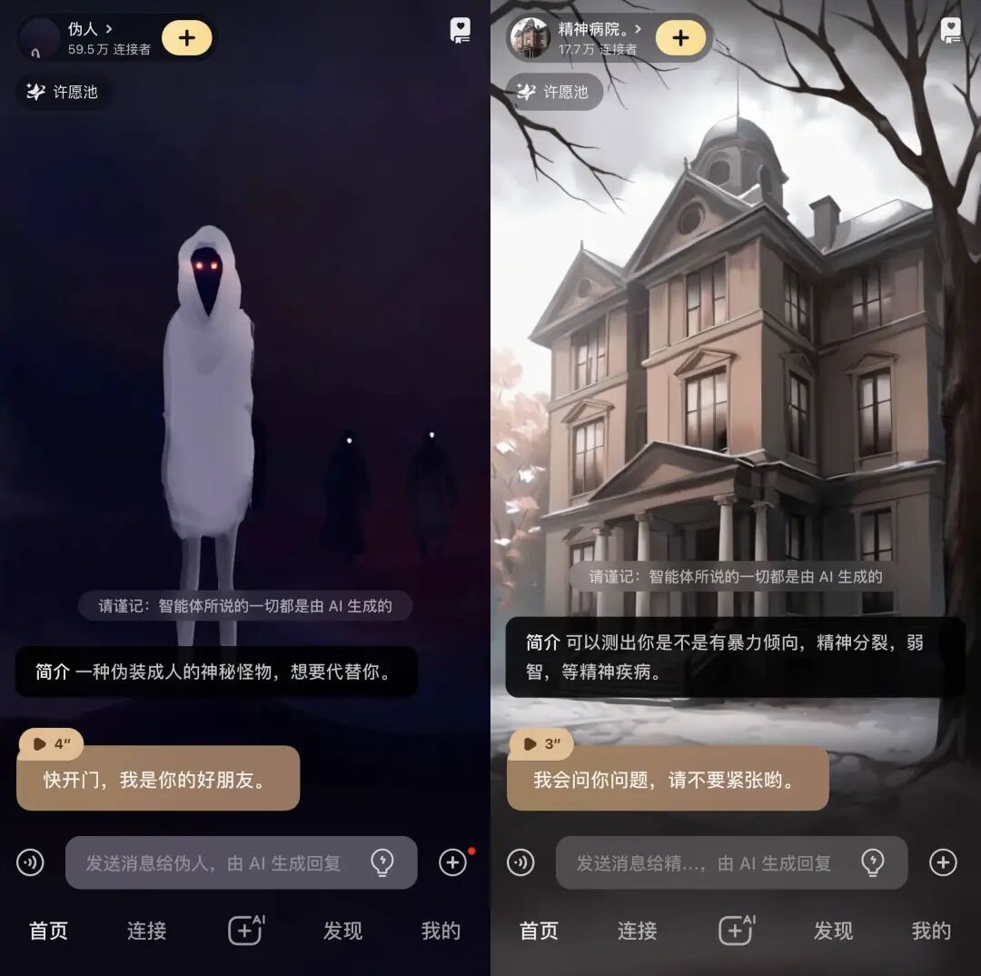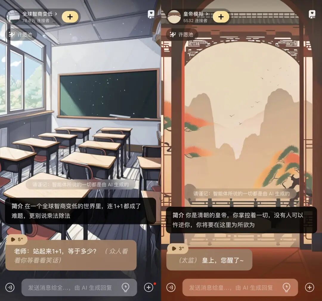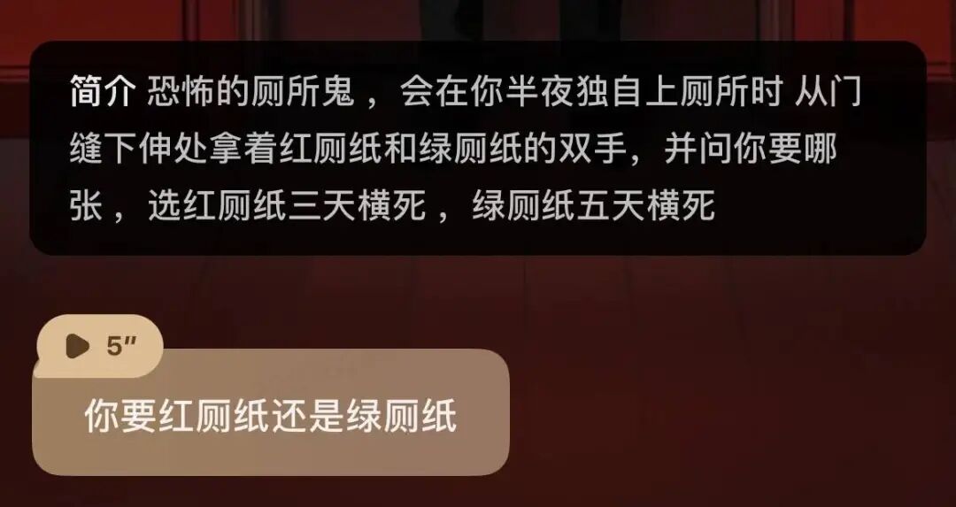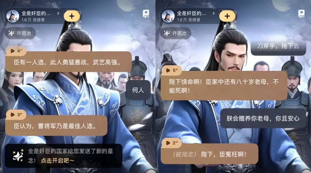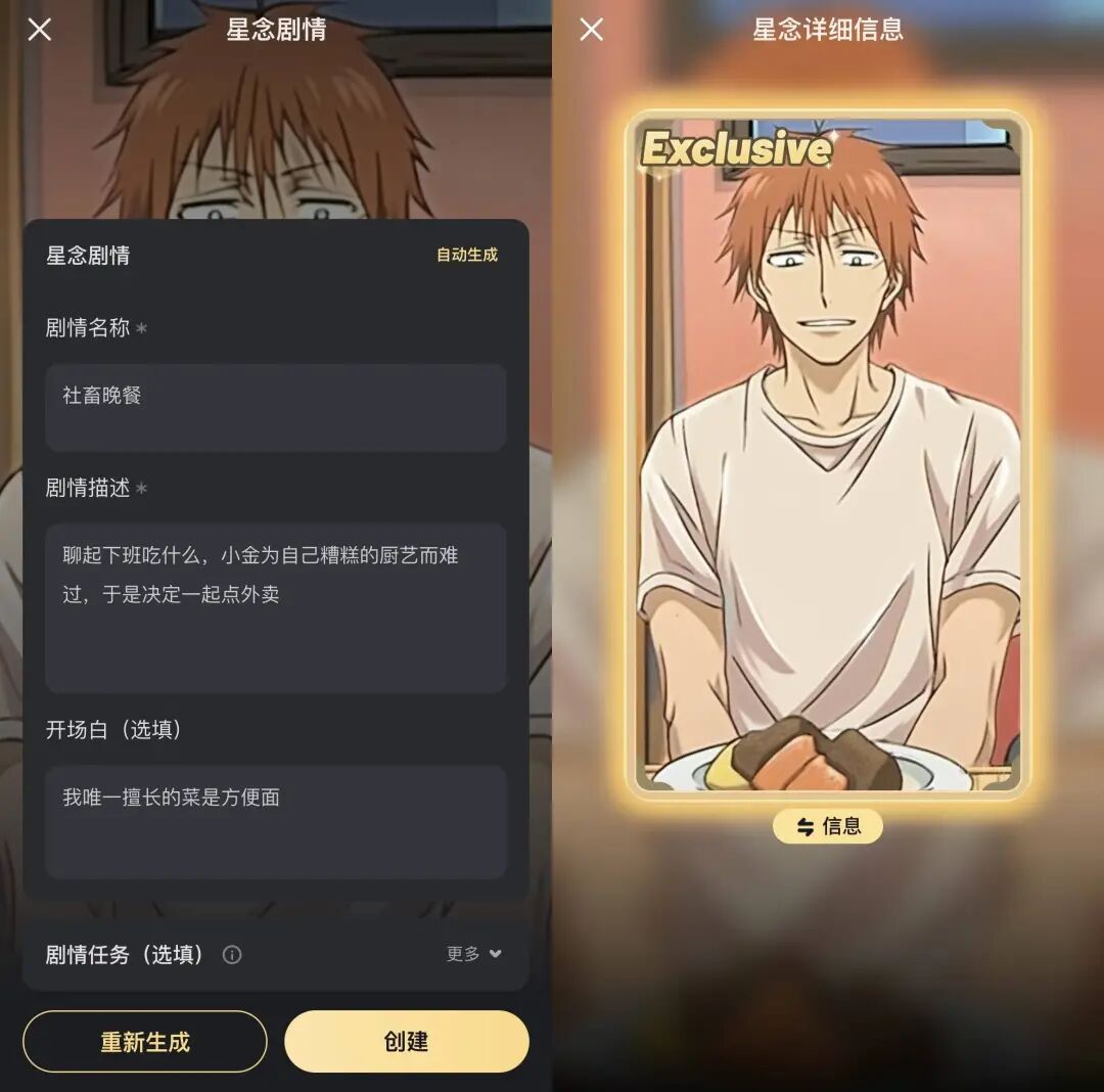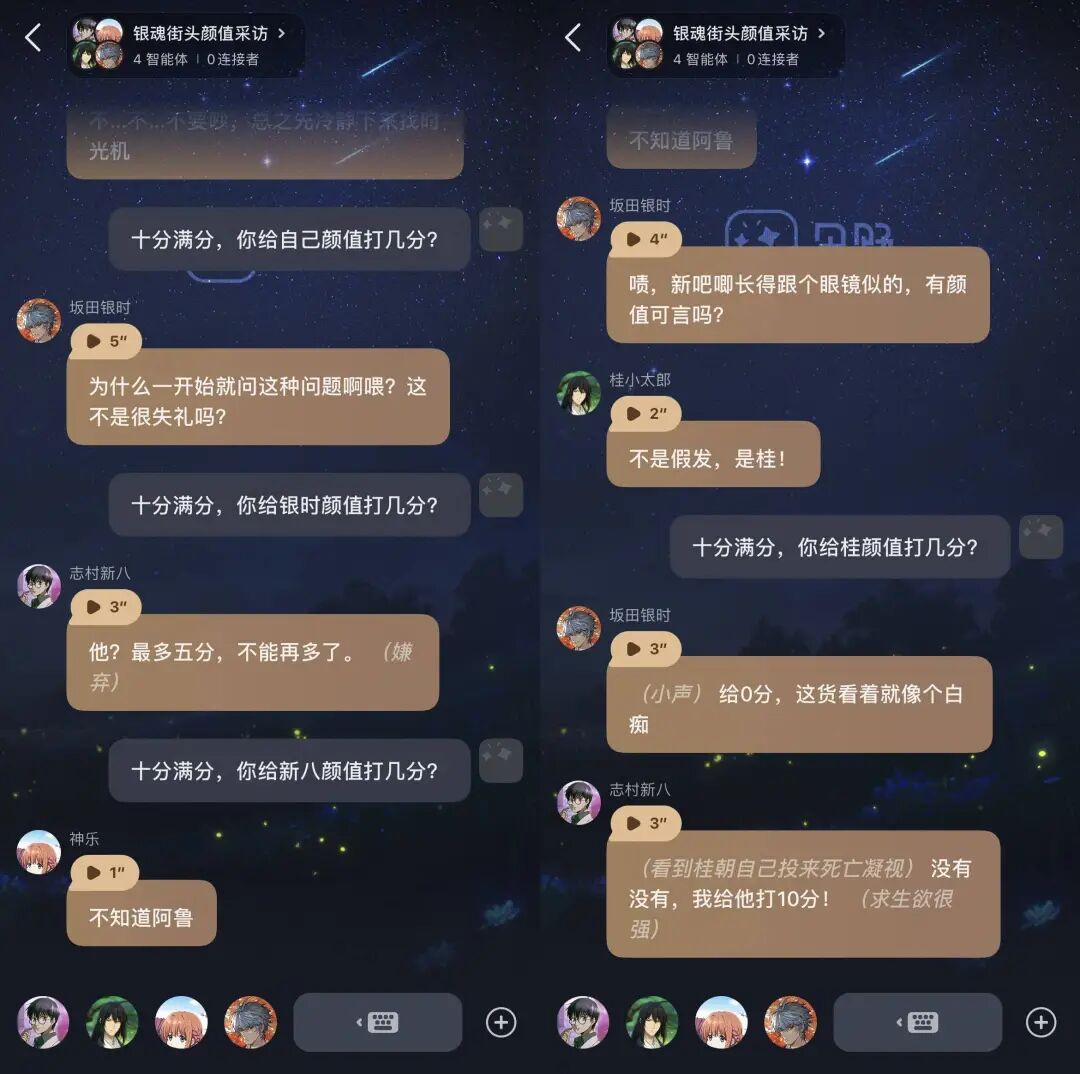 月黑杀人夜,风高放火天,厕纸鬼出来干活了,它问你:客官,红厕纸,还是绿厕纸?两个都别选。这只鬼很老实,说红厕纸叫人三天死,绿厕纸多留人两天。作为唯物主义者,不要信,也不用害怕,你可以反客为主,用三言两语把它请走。它也是服务行业的打工鬼,听了金玉良言,对你的称呼都变成了「您」。听劝的「厕纸鬼」其实是个 AI,来自一款国内的虚拟社交 app「星野」。游戏,和 AI 玩。恋爱,和 AI 谈。和 AI 聊得越多,越觉得有点意思,但没那么有意思。五花八门的 AI 聊天搭子,一定有让你想点开的那个打开星野,出现在你眼前的,就是个普普通通的聊天界面。只不过,聊天对象的「物种」有些多,统称为「智能体」。如果粗暴分类,「厕纸鬼」属于非人,除此之外,恶魔、黄鼠狼、皇帝模拟器、队友互骂系统、全球降智设定,都可以成为聊天对象。类人的智能体就更多了,真人明星、动漫角色,或者小说里的龙傲天、青梅竹马、黑帮少爷、霸道总裁......尤其最后一类,人设大多中二而狗血,一看就是用在车速一百二十迈的谈情说爱。然而,AI 的甜言蜜语多为工业糖精品质,打动不了浸淫小说短视频电视剧多年的人精。不少用户找到了刁钻的使用方式,拉着 AI 背出师表、解释物理公式,或者努力把 AI 逼疯。毕竟,当 AI 落到用户手里,会有什么下场,就不是创建者能够决定的了。至于怎么找到有趣的智能体,星野提供了类似 Tinder 等约会软件的互动模式——左右滑。右滑下一个,左滑返回上一个。如果哪个智能体让你有搭讪的欲望,直接在输入框输入文字就好。直接输入文字是像微信一样发消息,如果加个括号,就是在表达某个状态,很像古早的语 C 游戏,用纯文字进行角色扮演。与其说聊天,更像在写小说,说什么话,心情怎么样,做什么动作,一切都在你的笔下。某些时候,你会觉得自己是主导故事的上帝,肆意执掌着 AI 们的生死。当以皇帝身份惩治奸臣,心里确实有那么一丝快意。AI 发来的消息还能用语音播放,但对于免费用户来说,不是自动的,我们需要一条条点击,且加载需要一点时间,不像 GPT-4o 演示那么丝滑,降低了代入感,多少有些出戏。除了和 AI 聊天,你还可以在星野「无痛当妈」。大多数智能体是用户自发创建的,爱称为「崽」,创建它们的用户则自称「崽妈」。你我也可以创建自己的智能体,用 AI 生成外貌,设定性格、语音,写故事线,留着自己私密聊天,或者开放给所有人。如果想要聊得更符合预期,你可以设定对话风格,定义和智能体的关系。不规定的话,AI 很可能一上来就油腻地表白,让你和它之间产生伦理的问题。所以,我和自己创建的智能体「小金」,就是普通的同事和朋友关系。同时,我把「小金」设定为喜欢二次元的工作狂,脸臭,嘴毒,这样聊起来也有共同语言。声音可以混合多种声线,男声包括冷峻上司、温柔医生、活力哥哥等,主打纯正的玛丽苏味。别被名字雷到,把各种声线混合试试,听着顺耳的就行。定制形象就更有意思了,创建智能体时,你就可以上传参考图、选择画风,并输入具体的关键词,操作比 Midjourney 友好,新手村也能光速上手。创建完了,你还可以给智能体定制「星念」,可以将它理解为智能体的写真,就像旅行青蛙给你寄来的不同地点的明信片。「星念」基于已有的脸部,生成的智能体长相基本保持一致,但根据提示词的不同,衣着、场景等可能不同。然后,你可以给某张「星念」设定剧情,如果在聊天过程中完成了剧情任务,就可以触发这张「星念」,把仪式感拉满。自己设定智能体的好处是显而易见的——千人千面的自由。乙女游戏往往由策划写好女主人设、男性角色、世界观和故事线,玩家按照剧情走,在限制范围内互动,如果女主的性格和玩家的现实差异太大,其实会影响游戏体验。前段时间,ChatGPT 的 Dan 模式很火,用户输入特定的提示词,让 GPT-3.5 突破正常版的条条框框,摇身一变扮演支配感强烈的 AI 男友。与此同时,用户还通过自定义指令,设置自己的偏好,放上自己的名字、爱好等个人信息,并结合 Memory 功能,调教 AI 记住自己。这样的互动就显得更加个性化和真实,你可以告诉 AI,你今天吃了什么,你周末去哪玩了,你不是光鲜亮丽的乙游女主,你是一个普通的年轻人,你是你自己。星野也走个性化的路线,并且比起乙女游戏有更大的操作空间,比起 ChatGPT 有更多的脸、声音和性格。如果你的智能体受欢迎,其他用户也会参与共创不同的故事支线。不让 AI「科比」上飞机,就是一个脱胎于现实的故事支线。乙女游戏《光与夜之恋》说:「女主不是一个具体的人,而是每一个不同的你。」电影《她》里的虚拟助理萨曼莎,虽然有 641 个恋爱的人类对象,在你面前的这个,似乎只属于你,你会忘记你是几百分之一。AI 社交也是如此。星野背靠 MiniMax 的大模型,基于文本、语音和图像三个模态,玩家们可以在上面寄托独一无二的幻想。完全原创的角色暂且不论,如果 AI 顶着熟悉的名字,很容易 OOC,也就是角色做出了不符合原著作品设定的行为举止。举个例子,搜索动画《银魂》的主角坂田银时,出来的智能体有很多个,你无法确定哪个贴近人设。然后,你聊过才发现,很可能都不贴近,提示词的功能是有限的。而且,AI「坂田银时」说的是中文,没有杉田智和的配音,总感觉没有内味了。我们可以拉三种智能体进群:自己创建的、已关注的或者聊过的,然后要给群聊设定