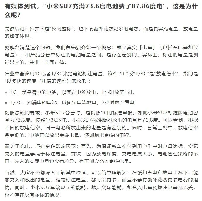 小米汽车官方今日发布《小米SU7答网友问(第四十二集)》,针对部分用户关心的产能和交付提升进展、充满73.6度电池费了87.86度电等问题进行了解答。(小米汽车)