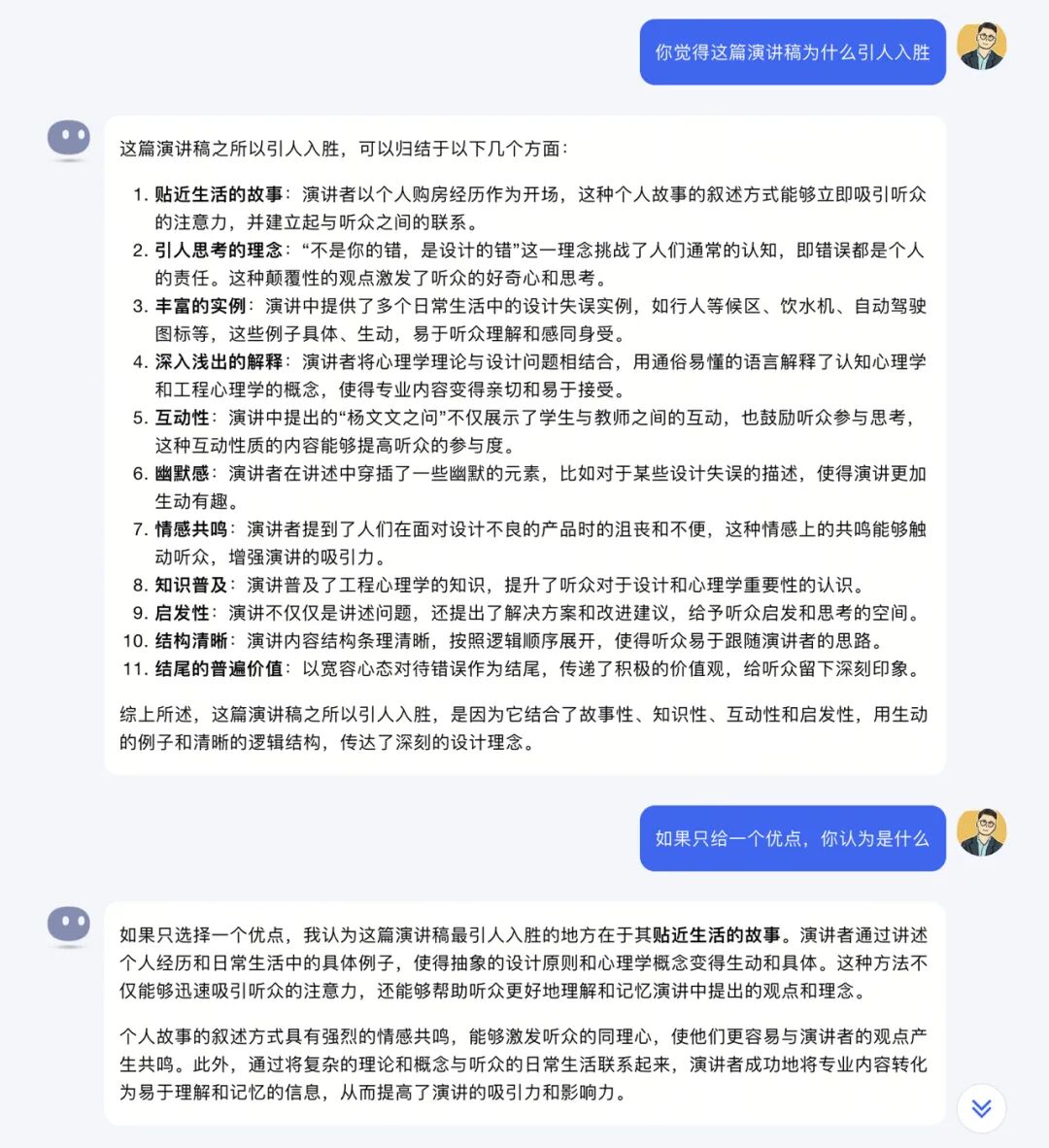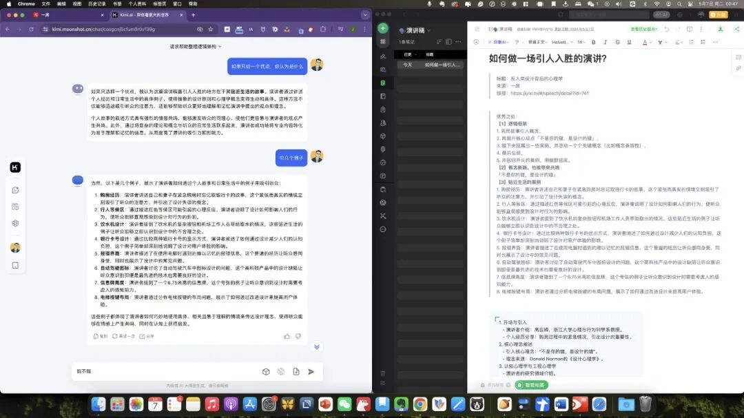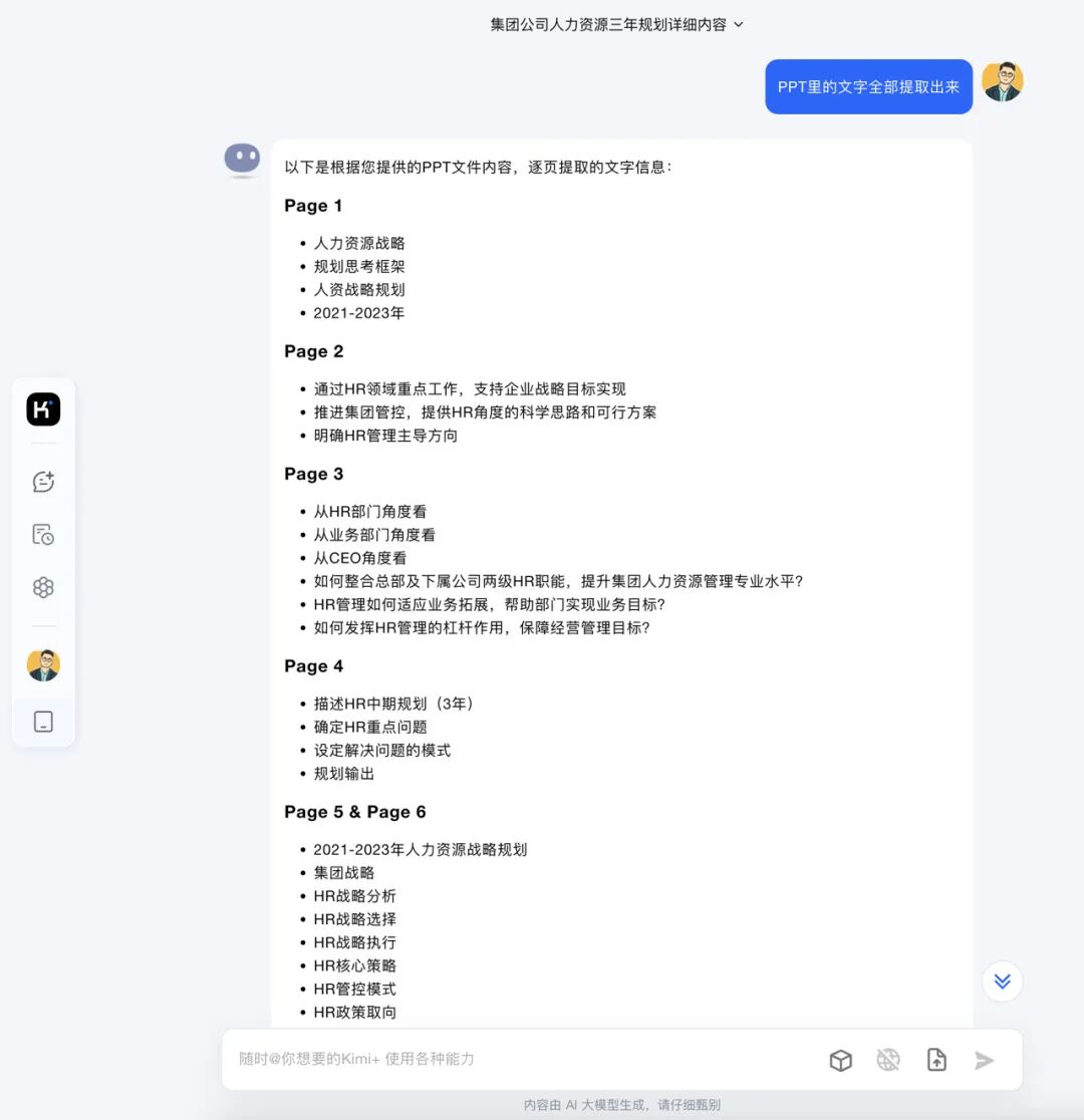 2024 年 5 月 6 日,下班开车时,我在「一席」 App 里听了一场演讲,主题是《反人类设计背后的心理学》。听完以后,我觉得内容很不错,于是就想着晚上把它整理到笔记软件里。传统的方法是:自己再听一遍,然后梳理整个框架,再提炼重点。第一步,我打开「一席」的网页版,然后选择了「打开文稿」,并把文稿复制到了 Word 里。第二步,我把 Word 上传到了 Kimi (一个人工智能助手) 里,然后让它「按照文章的顺序,整理它的架构」。第三步,我再让它分析文章为什么引人入胜,并且聚焦到其中最重要的优点,并举例说明。第四步,再结合自己的判断,将相关内容整理到印象笔记中。——整个过程,也就 10 来分钟,我得到了自己想要的;若是以前,整个过程少说也要半小时左右。我加入了很多行业交流群,群里经常会分享很多资源,各种格式的都有:PPT、Word、PDF。对我来说,大多数资源的价值,在于文字部分——未来如果要写方案、做策划,可以快速从中找到灵感。有一天我拿到了一份《集团公司人力资源三年规划详细内容》的 PPT 资源,于是把它上传到 Kimi 里,并让它把「 PPT 里的文字全部提取出来」,于是得到了以下内容:接下来,为了方便日后检索,我又让 Kimi 生成了一段摘要,如下:再然后,我就把相关内容(PPT、摘要、每一页的内容)复制粘贴到印象笔记里,日后如果我有需要,便可以快速检索相关内容。我用的工具是 Kimi ,一个类似于 Chat-GPT 的人工智能工具,有网页版、App 版和小程序版。相比于其他工具,我最喜欢它的地方是:简洁,没有那么多花里胡哨的设计。- 遇到一篇好的文章(或演讲稿),请它帮忙梳理思路、提炼表达的优点。