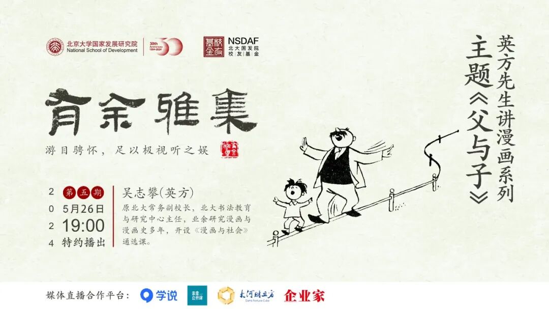 作为北大国发院30周年庆人文讲座系列的重要部分,《有余雅集》系列活动第五期将邀请原北大常务副校长,北大书法教育与研究中心主任吴志攀(英方先生)以《父与子》为题,讲述漫画背后的故事。