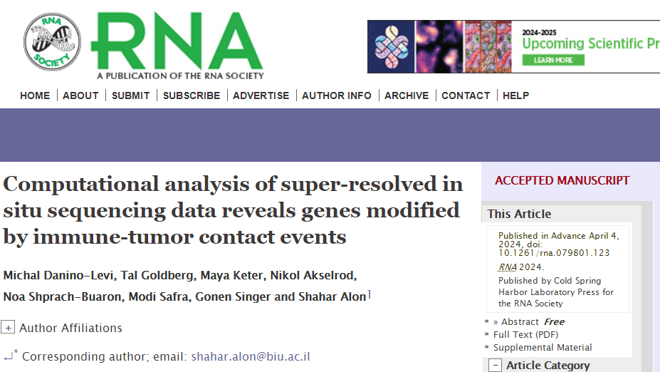 Michal Danino-Levi, Tal Goldberg, Maya Keter, et al. Computational analysis of super-resolved in situ sequencing data reveals genes modified by immune-tumor contact events, RNA (2024). DOI:10.1261/rna.079801.123
