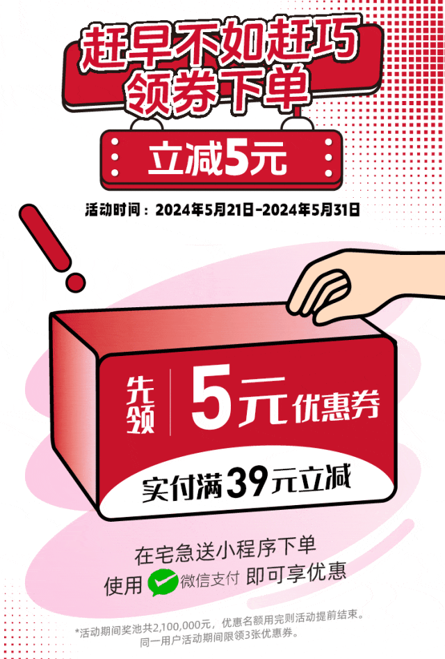 1)2024年4月15日00:00至2024年5月31日22:00,进入“必胜客”微信小程序的微信支付优惠页面,即可领取价值5元优惠券一张,券有效期为领券后7天内有效,用户应于领券有效期内核销使用 。2024年4月15日至2024年5月31日,用户通过“必胜客”“必胜客宅急送”“必胜客外带”“必胜客自助点餐”微信小程序点餐,凭券单笔订单实际支付金额(含配送费)满39元,使用微信支付(不含微信支付亲属卡功能及云闪付支付方式)可享立减5元优惠。活动期间奖池共2,100,000元,优惠名额用完则活动提前结束。活动期间若用户领券后未在领券有效期内核销,则优惠券失效。优惠名额将于两日后(需在活动期间内)自动释放,用户可参与领券。