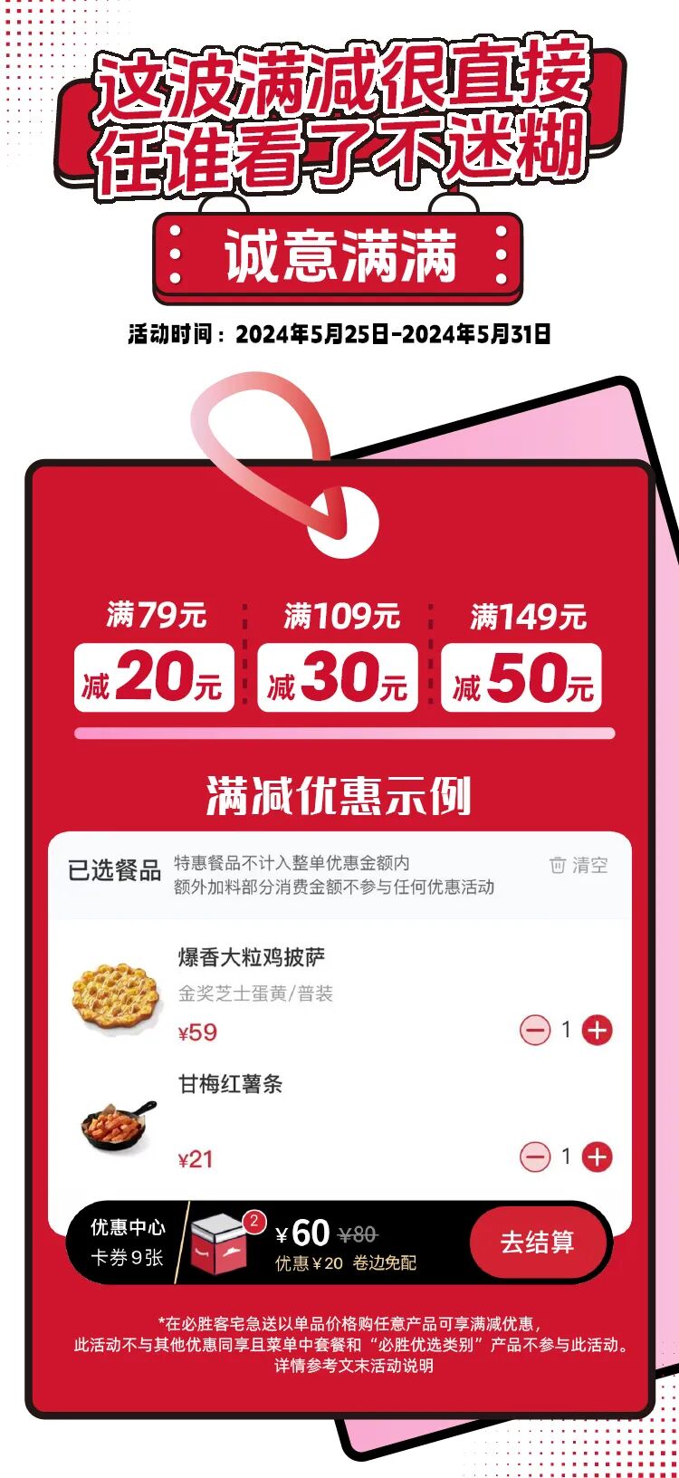 以单品价选购任意产品,且单笔实付金额满 79元可享立减20 元优惠一次;单笔实付金额满 109 元可享立减30元优惠一次;单笔实付金额满149元可享立减50元优惠一次,且单笔订单仅可享受一次满减优惠,系统将根据结算页面显示的实付金额自动匹配最大优惠活动。*本优惠活动不可同时使用且不与其他优惠同享且菜单中套餐和“必胜优选类别”产品不参与此活动。全品类非折扣美味在活动期间价满立减。