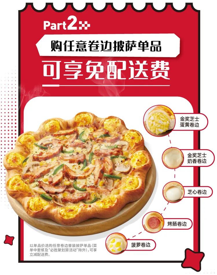 通过必胜客宅急送官方网络订餐,以单品价选购任意卷边普装披萨单品(菜单中套餐及“必胜聚划算活动”除外),可享立减配送费。必胜客宅急送部分门店不参与以上活动,具体以输入送餐地址后显示的菜单为准。