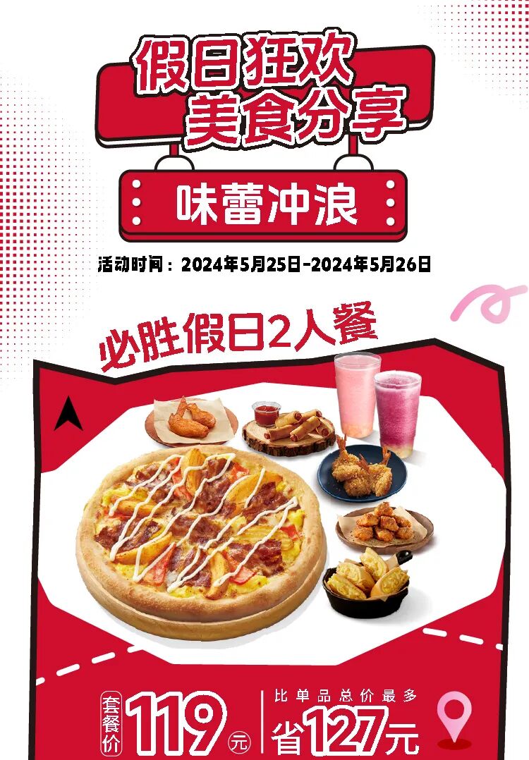 官网订餐指通过必胜客手机APP、手机WAP、必胜客及必胜客宅急送官方微信或官方支付宝订餐;活动不适用于机场、火车站、高速公路、旅游度假、游乐场、展览馆、奥特莱斯、精选餐厅、Les Elites以及部分必胜客特定餐厅,请详洽餐厅。活动优惠权益不与其他任何优惠共享。“单品价”产品不含菜单中的“特/惠/券”产品、套餐产品及必胜优选系列产品。图示内容仅供参考,产品及包装请以实物为准。必胜客宅急送不同送餐区域的菜单和价格有所不同,不同时段产品品项及价格有所不同,详情以输入送餐地址后显示的实际供应的菜单为准。 如遇活动套餐/产品售罄,将为您替换为相近套餐/产品。必胜客宅急送各门店均有送餐范围限制,若您的送餐地址不在送餐范围内,我们将无法为您提供外送服务,敬请谅解。被比较价格是指套餐内的产品在必胜客宅急送官网上同款产品单品价的总和,所称优惠或折扣金额均以此为计算依据。如有疑问,请咨询必胜客在线客服。