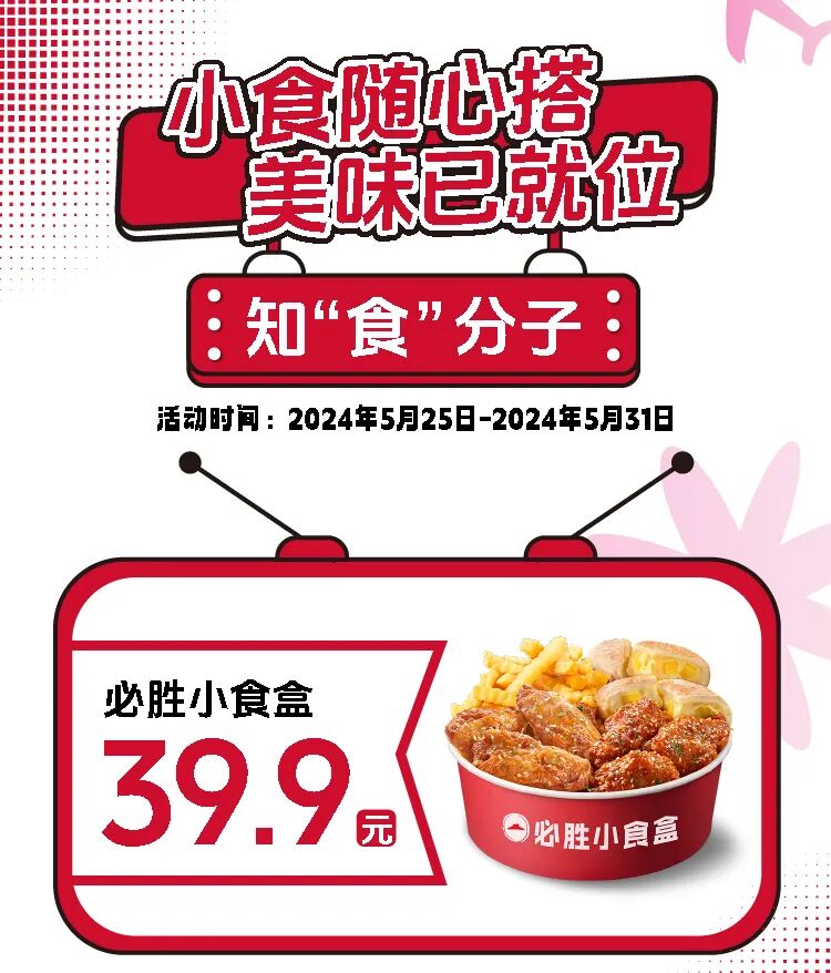 活动地区:全国。活动渠道:仅限堂食、扫码点餐外带自取和必胜客宅急送渠道,不适用于第三方外送平台。必胜小食盒内含:蜜制酱烤香骨鸡(3只装)/香草凤尾虾(3只装)/浓情烤翅(2只装)/椒盐香香鸡(中份)/热辣孜然香香鸡(中份)/三芝芝士挞(1只装)/金枕榴莲芝士挞(1只装)/甘梅红薯条(1份)/奶香芝士菠萝卷(4只)/一口波波香肠卷(6只)任选4件,套餐内实际可选产品以餐厅当天供应时段内产品为准。本活动优惠权益不与其他任何优惠共享。“单品价”产品不含菜单中的“特/惠/券”产品、套餐产品。图示内容仅供参考,产品及包装请以实物为准。