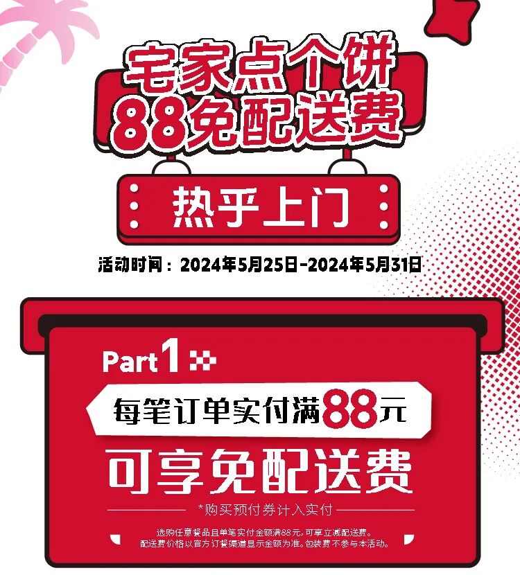 选购任意餐品且单笔实付金额满88元,可享立减配送费。配送费价格以官方订餐渠道显示金额为准。包装费不参与本活动。