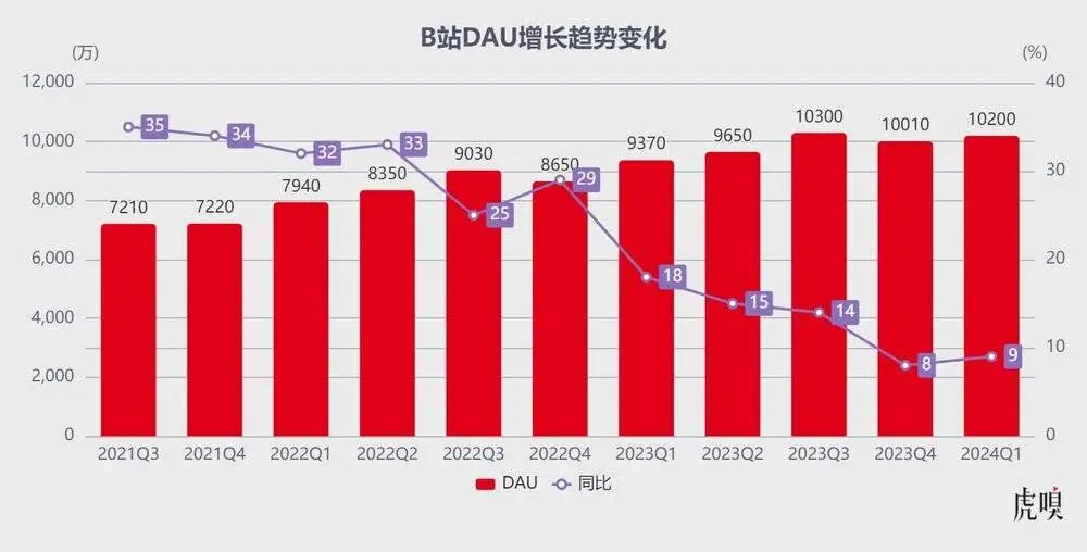 一是,用户盘持续扩张。2024Q1 季度 B 站 DAU(Daily Active User,日活跃用户数)同比增长9% 达1.02亿;B 站 MAU(Monthly Active User,月活跃用户)为 3.41 亿,环比增加 500 万人。