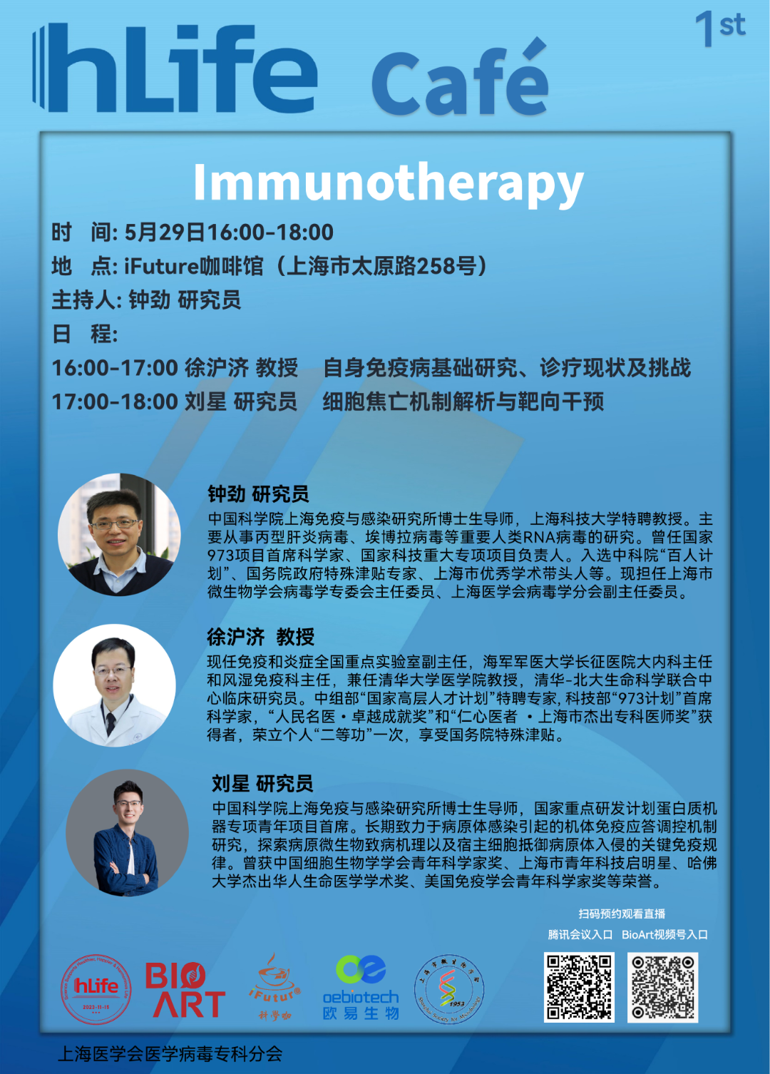 本次活动特别邀请中国科学院上海免疫与感染研究所博士生导师钟劲研究员作为主持人、海军军医大学长征医院大内科主任和风湿免疫科主任徐沪济教授、中国科学院上海免疫与感染研究所博士生导师刘星研究员做客BioArt和iFuture科学咖以《hLife Café:Immunotherapy》一同探讨自身免疫病和细胞焦亡机制解析与靶向干预的研究。期待各位专家老师的精彩报告!欢迎预约本次直播间哦~