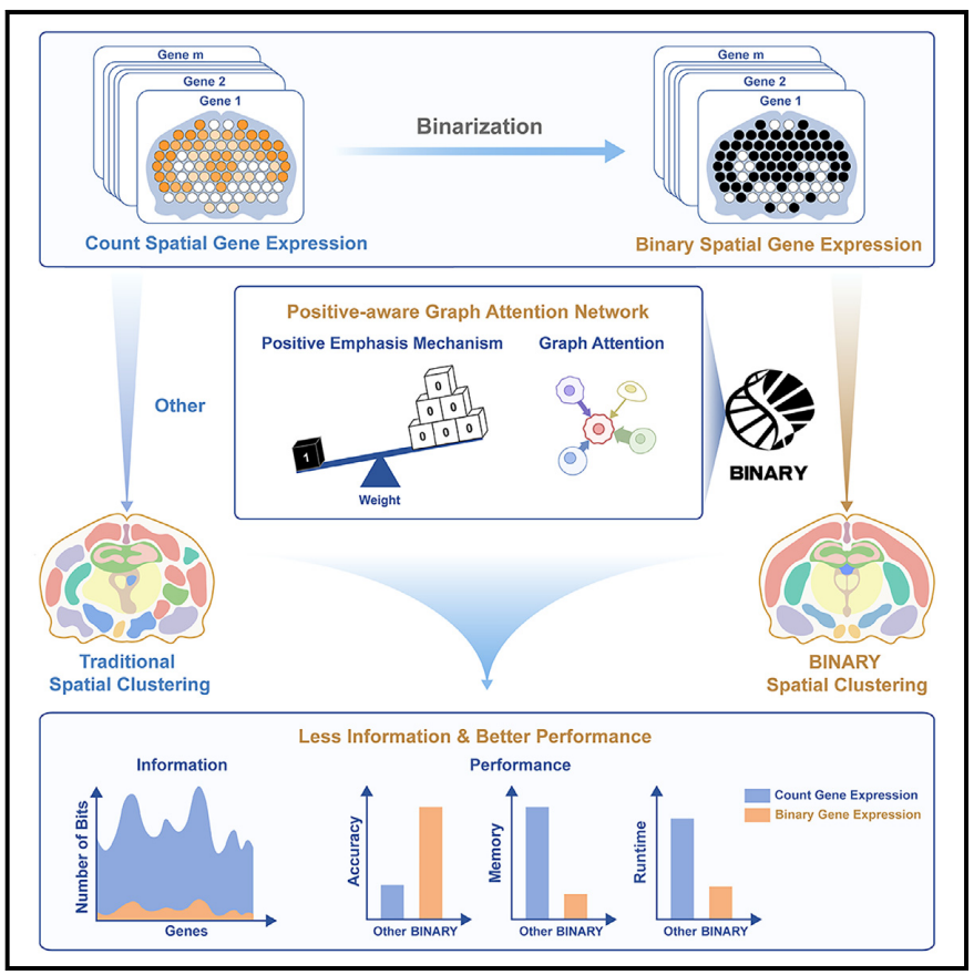 空间分辨转录组学(SRT)技术的进步显著推动了人们对组织结构的理解。通过空间聚类技术分析SRT数据,研究者能够识别出组织中的不同空间结构域,从而从以细胞为中心转移到更高层次的以组织结构为中心的生理学视角。除了大多数空间聚类方法常使用的SRT数据的两个主要模态(基因表达和空间坐标),很多新的方法的趋势包括整合更多的信息来识别空间域,像整合补充图像(如免疫组织化学图像、H&E图像、染色质图像等)、人类注释、配对scRNA-seq数据或其他空间组学数据。在这种情况下,存在一个值得深思的问题,是否可以用更少的信息来准确地识别空间域。近日,复旦大学类脑智能科学与技术研究院原致远联合中国科学院计算技术研究所赵屹团队在Cell Genomics杂志在线发表题为Complete spatially resolved gene expression is not necessary for identifying spatial domains的研究文章。研究人员介绍了一种名为BINARY的深度学习方法,该方法通过使用二值化的空间转录组学数据来准确识别组织内的空间域。他们的研究表明,识别空间域所并非需要完整的基因表达计数,这为利用简化的空间数据在空间组学应用中开辟了新的可能性。该研究团队首先设计了一种完全依赖于二进制化空间分辨转录组学数据,结合了图注意力机制网络和正项强调机制的空间聚类方法BINARY来描绘空间域。在广泛的基准测试中,BINARY优于当前最先进的基于完整空间解析基因表达的聚类方法。从基于下一代测序到基于成像的技术,BINARY在mRNA捕获率和基因通量之间的权衡比其他方法更有效。在大型MERSCOPE大脑数据的多切片联合分析中,只有BINARY可以在不超过内存限制的情况下,准确识别已知的大脑结构,并确保在切片之间自动对齐标签。随后,这项研究还探索了BINARY在其他空间组学应用(如识别空间变异基因和揭示梯度特征)和空间组学数据扩展(如空间蛋白质组学)中的潜在用途。这些研究结果表明,空间分辨转录组学数据的计数形式可能包含比空间域识别任务所需更多的信息,这一发现可能会重塑空间转录组学应用和其他空间组学领域的计算任务。复旦大学类脑智能科学与技术研究院原致远和中国科学院计算技术研究所赵屹研究员为本文共同通讯作者,中国科学院计算技术研究所博士生林森林为本文第一作者。复旦大学、中国科学院、莫那什大学、腾讯AI Lab的合作专家给予了重要贡献。原文链接: