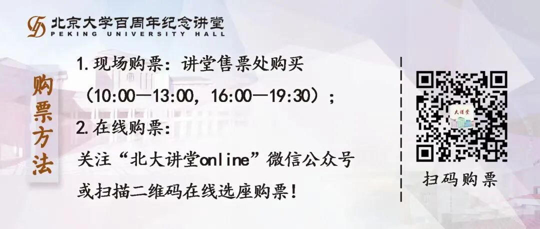 2.学校现在实行预约入校,校外人员购票后请务必最晚于活动开始前48小时在“北大讲堂online”公众号“我的订单”中补全入校身份信息,否则将无法入校,讲堂对相关损失不予受理。
