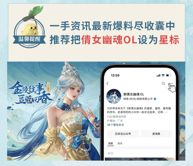 现在关注抖音官方账号@新倩女幽魂并发送关注截图+个人主页截图至微信公众号后台或微博,备注【抖音关注有礼】,即有机会获得【随机款鼠标垫】一份哦~