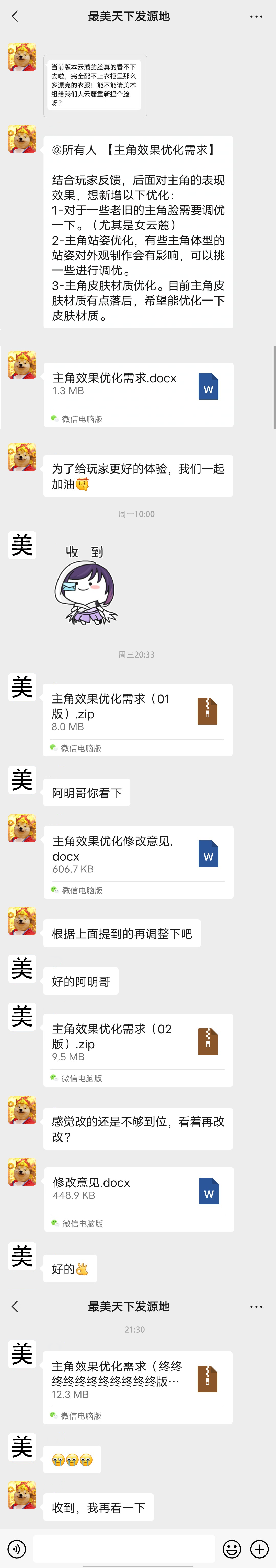 收到“订单”的狗策划阿明当即向美术同学的工位出发,提出了要对各门派角色的脸模、皮肤材质等整体面部表现,以及站姿呈现进行优化!也是从那天起,阿明仿佛成为了全体美术同学最大的敌人,小天曾偷偷潜入了阿明和美术们的群聊,只见双方你来我往,一不留神就会看到群里又多了99+消息,到最后美术同学发出的文件名后缀小天都已经看不过来了!