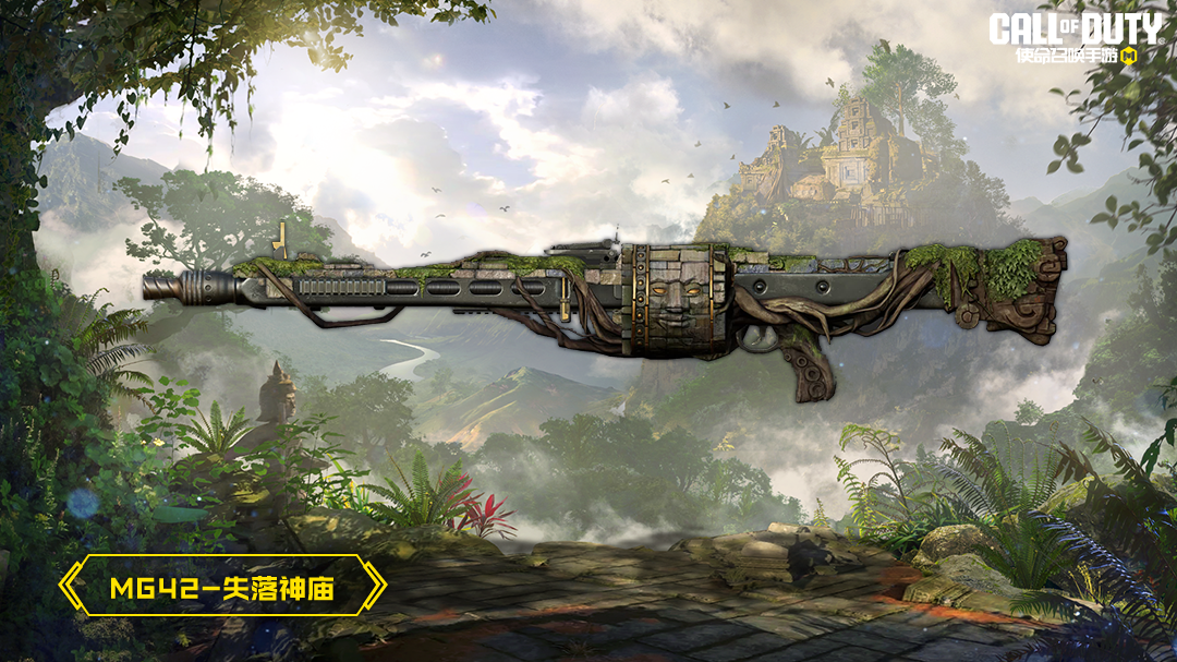 MG42-失落神庙将人类文明的遗迹与自然的生命力融为一体,武器的整体造型模仿了神庙遗址的斑驳与沧桑,仿佛是一段历史的见证者。枪管和枪托部分长满了苔藓,充满了历史的痕迹和故事感。树藤沿着枪身蔓延开来,充满了历史的痕迹和自然的生命力。