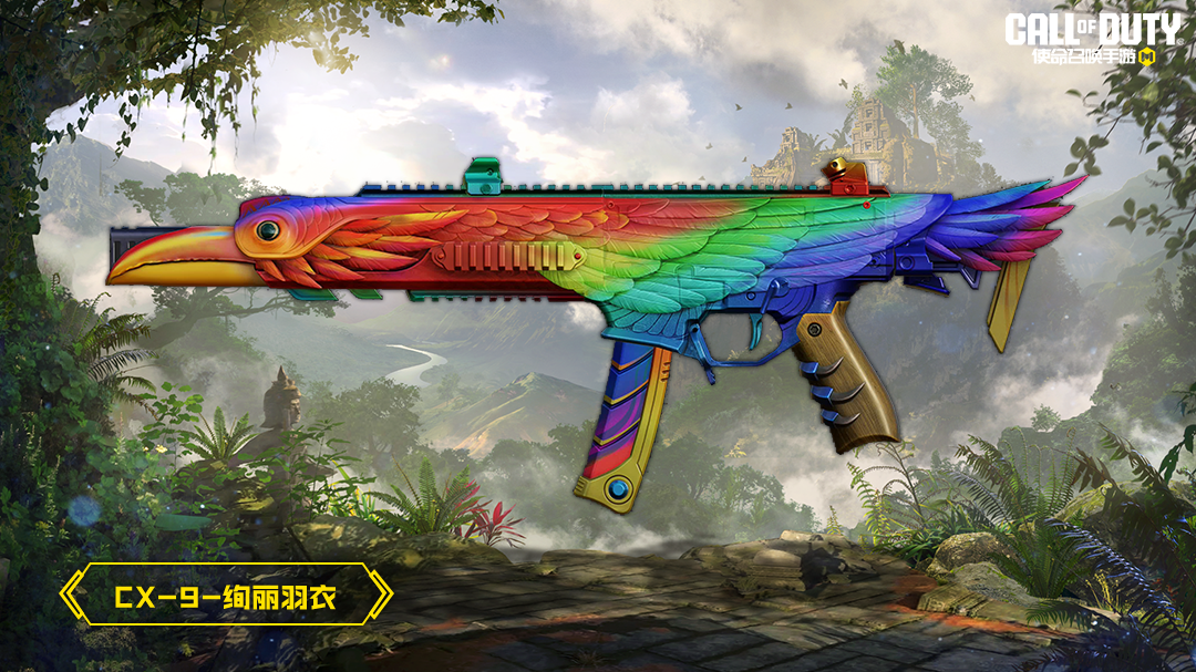 CX-9-绚丽羽衣这把武器在设计时,借鉴了热带金刚鹦鹉的造型,整体线条流畅,展现出一种生机勃勃的美感。华丽的羽衣呈现斑斓的色彩,宛如一道道流动的彩虹,格外引人注目。