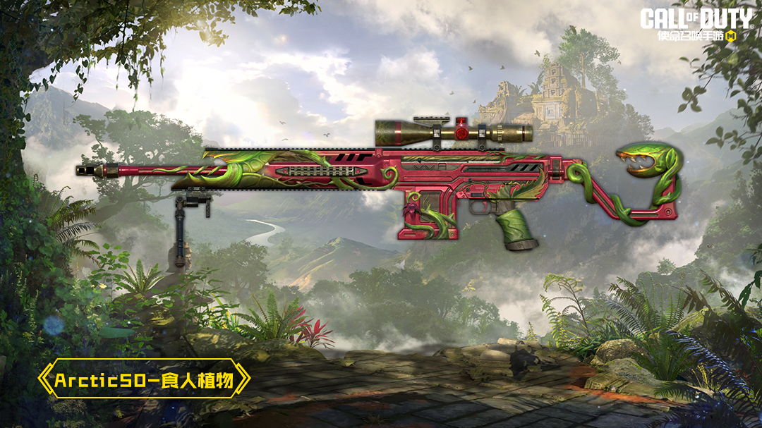 Arctic50-食人植物的设计灵感,完美地复现了食人花的颜色特征,这种色彩设计不仅为武器增添了一层自然的伪装效果,也提供了一种独特的视觉冲击力。枪托部分正附着一个长开的食人花,让敌人望而却步!