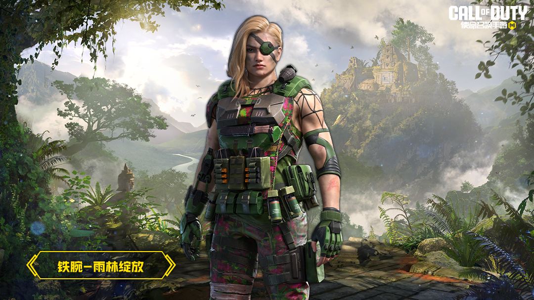 铁腕-雨林绽放就像一朵钢铁玫瑰,成为雨林中最坚固的防线。她左眼受伤,佩戴眼罩,但表情依然坚毅。坚实的臂膀裸露在外,给人可靠、有力的感觉。