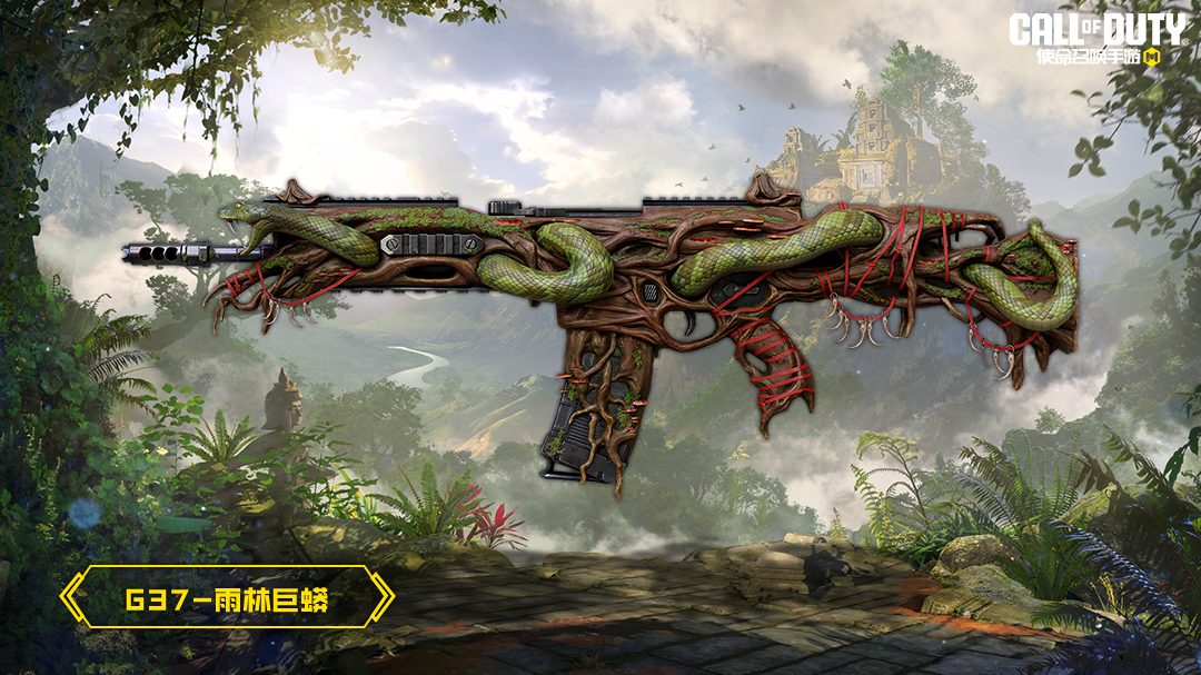 G37-雨林巨蟒在视觉上呈现出了一种野性与神秘的结合。它的枪身被藤蔓植物所包围,这些藤蔓仿佛是直接从枪身上生长出来一样,错综复杂地缠绕着,为武器增添了一层自然保护色。更为引人注目的是,一条巨大的绿色蟒蛇正紧紧缠绕在枪身之上,展现出一种危险的美感。