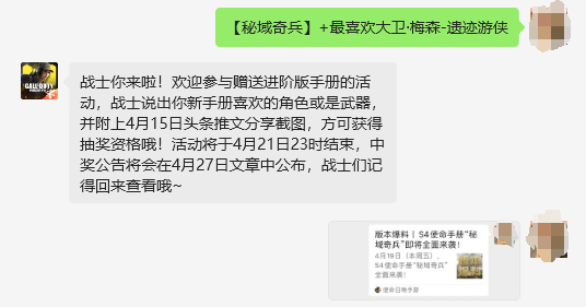 什么?怕评论区人太多机会少?不用担心,本汪一向雨露均沾!战士们现在前往《使命召唤手游》公众号后台回复关键词:【秘域奇兵】+喜欢的角色或是武器,并附上本篇推文的分享截图,瘦普依旧会从中随机抽取5名幸运战士分别赠送S4使命手册-进阶版*1,同样奖励将以888COD点券形式发放哦!