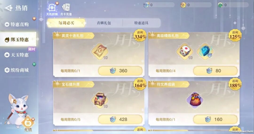 新增入口【绑玉特惠】包含原热销【绑玉必买】、【青麟礼包】,新增【特惠道具】页面。