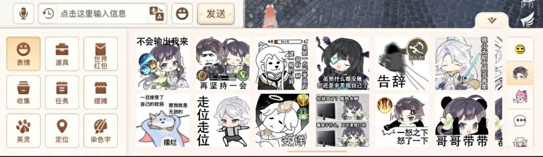 2.表情顺序优化:将不常用的表情包(例如文字)置后,顺序分别为:官方小表情、玩家收藏表情、职业表情、搞怪小谕表情、聊天气泡表情、官方大表情、青麟归表情、简短文字。