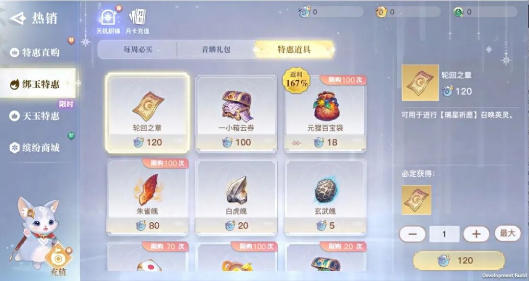 5.缤纷商城内绑定天玉道具全部迁移至【绑玉特惠】-【特惠道具】,本次调整后绑定天玉商品限购将全部重置。
