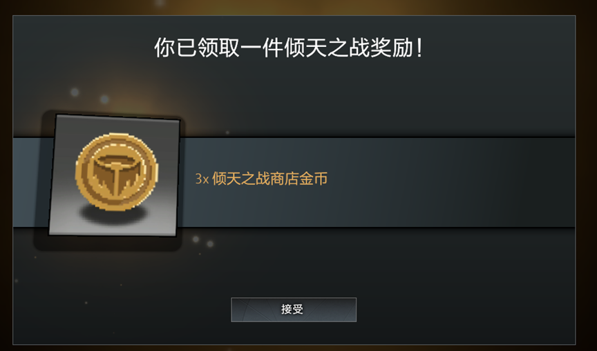 就这样,你已经获得了活动的第一份奖励,三个倾天之战商店金币,获得10个这样的金币可以在倾天之战商店享受55元的折扣。