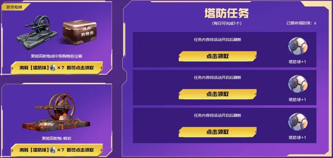 完成每日塔防任务获取塔防球,聚能高射炮或中级购物券宝箱,以及聚能高射炮-熔岩在等着你,助你火力全开!