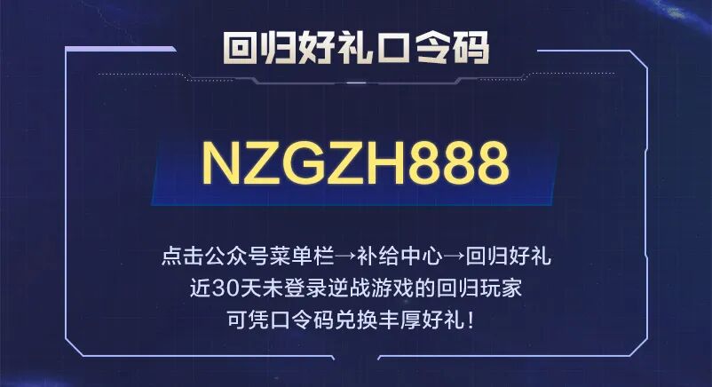 30天内,未登录逆战游戏的回归NZer,可以前往【逆战公众号】后台,点击菜单栏-【补给中心】,可凭借回归好礼口令码兑换丰厚奖励!