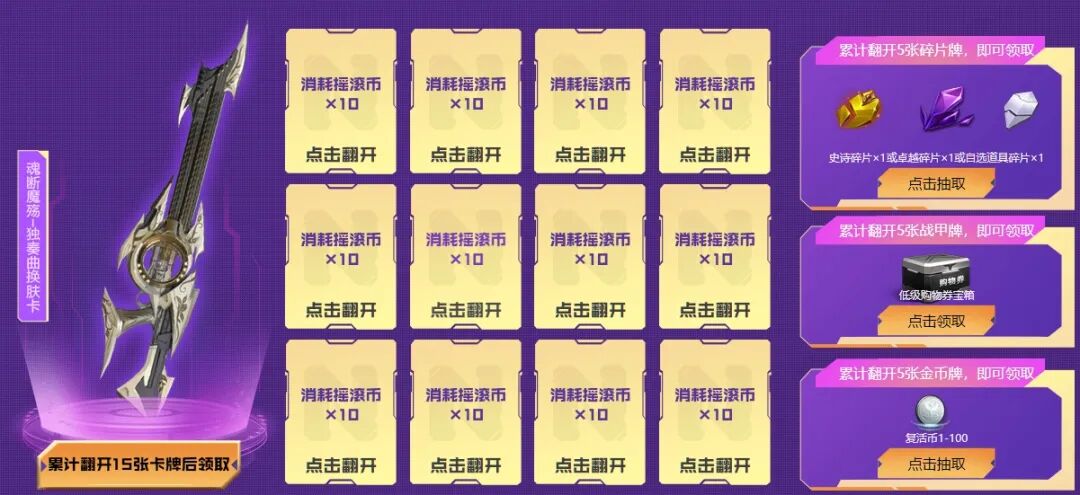 投入摇滚币,分别翻开5张碎片牌、战甲牌、金币牌,即可获得对应道具奖励。