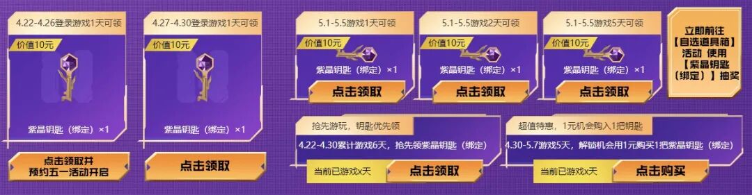 在4月30日前累计游戏6天,还可抢先领取三枚钥匙。4月30日至5月7日游戏5天,解锁1元购买1把紫晶钥匙机会!