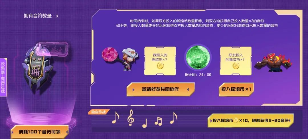 每投入10个摇滚币,还可随机获得5-20个音符。