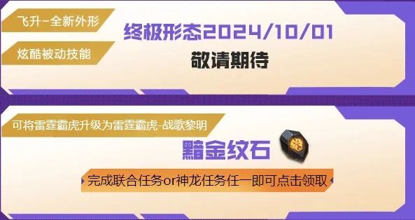 各位NZer可通过完成联合任务或神龙任务任意一种,获取黯金纹石,这是帮助雷霆霸虎再度升级的关键道具。