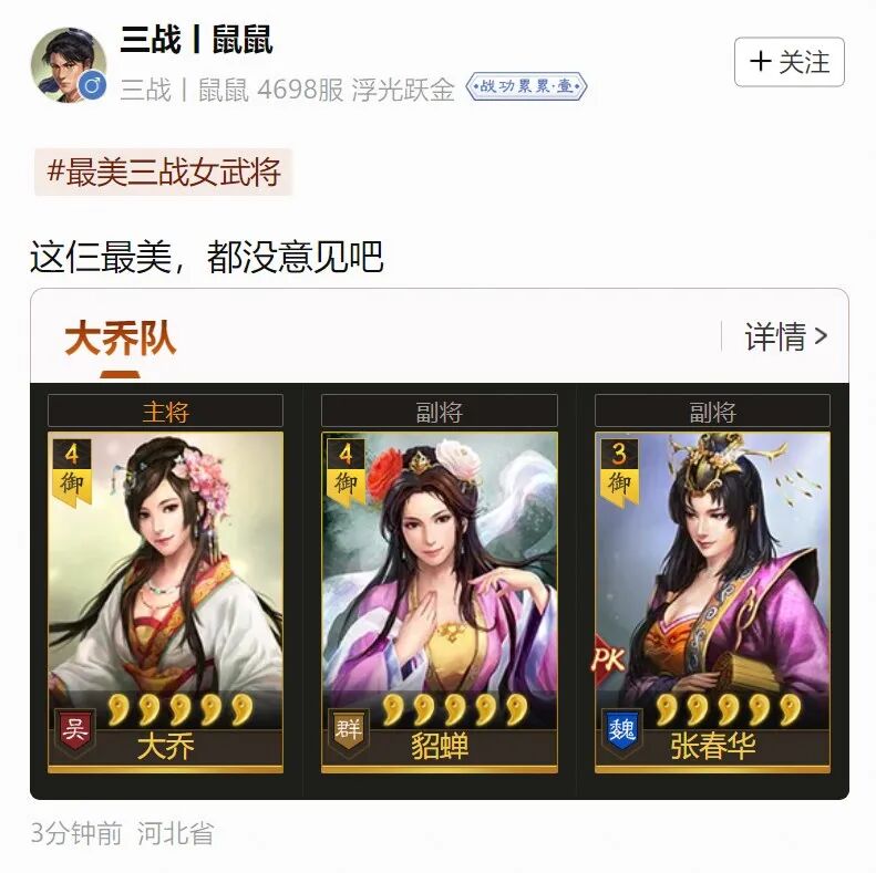 ①优质内容奖:小乔姐姐将会选取话题下,投稿最优质的3位主公,分别送出三战官方周边一份!(理由充分有创意,点赞数量高,更容易获奖哦!)