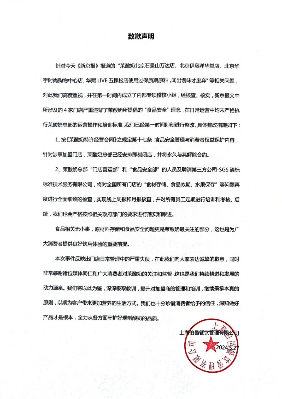 27日下午4时,茉酸奶通过官方账号发布致歉声明,承认使用过期原料。茉酸奶称,对于媒体曝光的相关问题高度重视,并在第一时间内成立了内部专项稽核小组,经核查、核实,报道所涉及的4家门店严重违背了茉酸奶所提倡的“食品安全”理念,在日常运营中均未严格执行茉酸奶总部的运营操作和培训标准,茉酸奶方面表示已经第一时间即刻进行整改。本次事件反映出门店日常管理中的严重失误,向大家表达诚挚的歉意。1、按《茉酸奶特许经营合同》之规定第十七条:食品安全管理与消费者权益保护内容,针对涉事加盟门店,茉酸奶总部已经安排即刻闭店,并将永久与其解除合约。2、茉酸奶总部“门店营运部”和“食品安全部”的人员及聘请第三方公司-SGS 通标标准技术服务有限公司,将对全国所有门店的“食材存储、食品效期、水果保存”等问题再度进行全面细致的检查,实现线上周报和月报核查,并对所有员工定期进行培训和考核。后续,我们也会严格按照相关政府部门的要求进行落实和跟进。声明 | 本文转自澎湃新闻、北京朝阳市场监管”微信公号、@茉酸奶、新京报、中国青年报等,在此致谢!