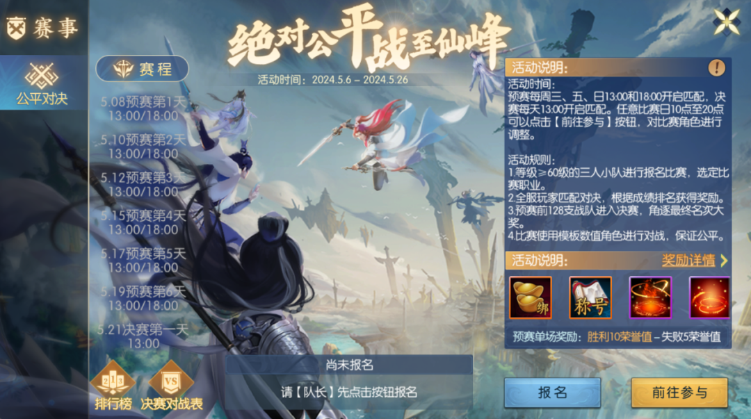 本次比赛为3V3公平竞技比赛,仙友需要组成3人队伍报名参赛。