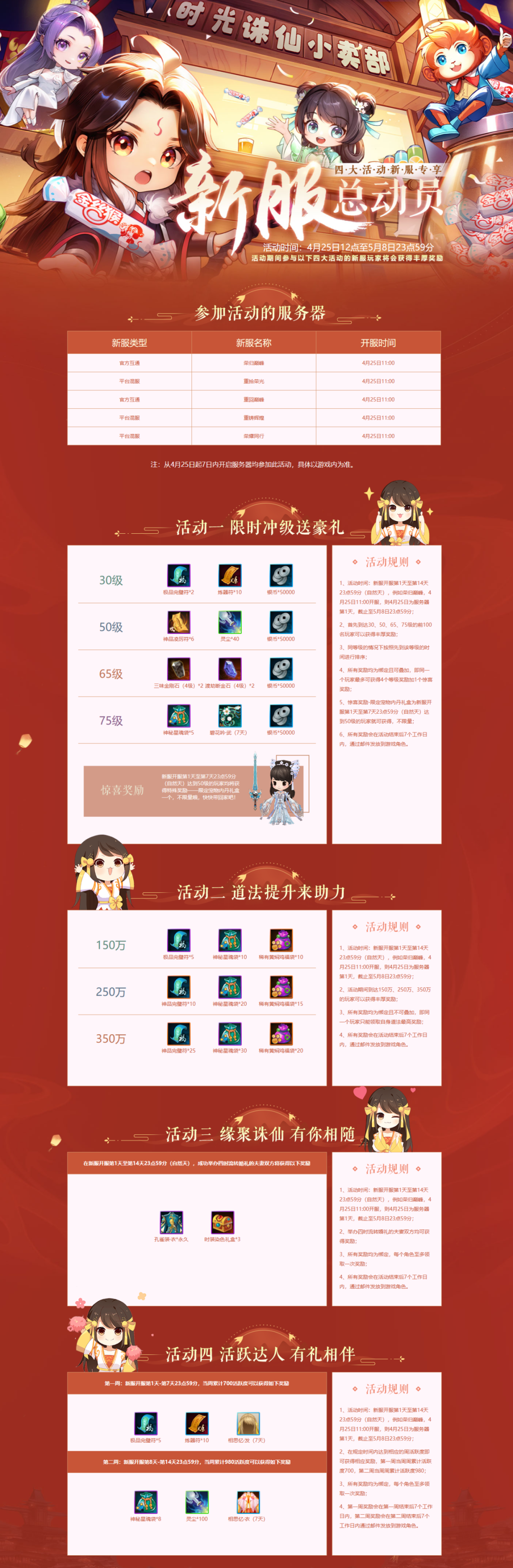 4月25日12:00-5月8日23:59活动期间内入驻官方新服即可参与新服限时冲级、道法比拼、四时流转婚礼、活跃达人等福利活动。