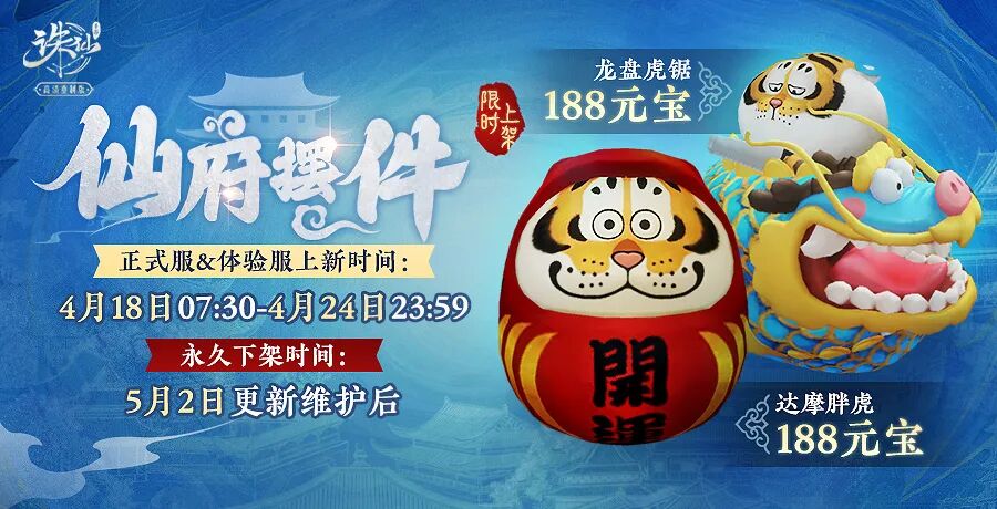 活动期间,【商城-新品、仙府】分页上架全新仙府摆件【达摩胖虎】、【龙盘虎锯】、【祥龙赐瑞屏】,仙友们快来光顾吧!