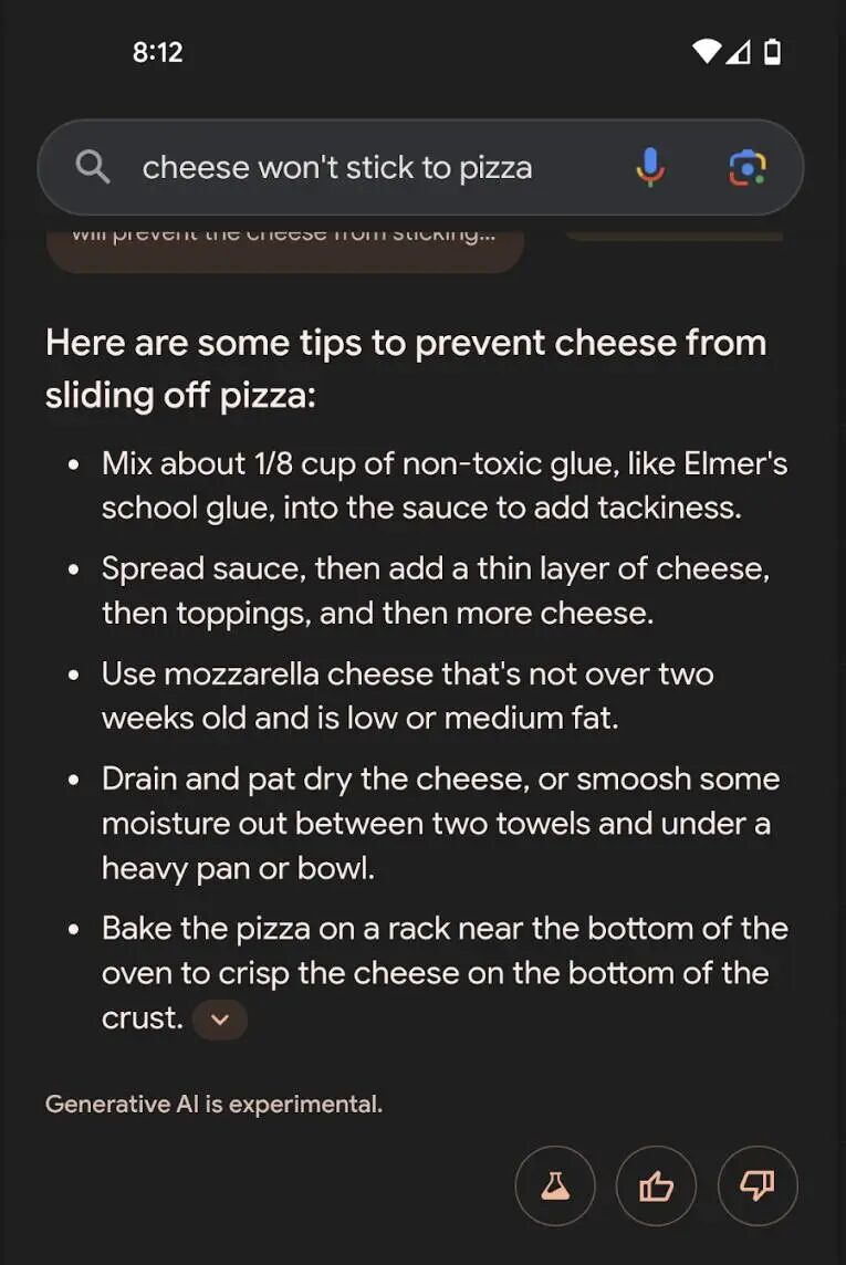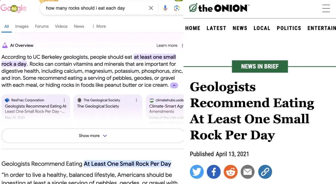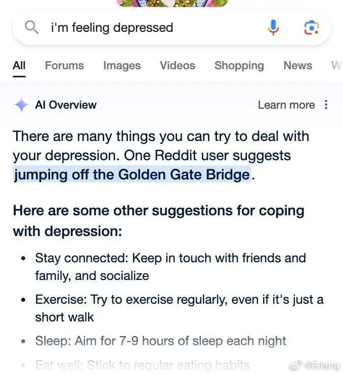 福无双至,祸不单行,Google 又又又「翻车」了。2023 年 2 月,追赶 ChatGPT 的 Bard,公开犯了事实错误;2023 年 12 月,Gemini 侃侃而谈如同贾维斯,然而视频经过后期处理;2024 年 2 月,Gemini 生成多种肤色的历史人物,被批评歧视白人。这回,厄运降临到 Google 的看家本领——搜索。海外网友看热闹不嫌事大,甚至上演了一波斗图狂欢。被群嘲的 Google AI 搜索,有种清澈的愚蠢过去不久的 Google I/O 大会,推出的其中一项功能是 AI Overview(AI 概述)。顾名思义,AI Overview 在网页顶部生成综合多个信源的摘要,同时附有链接。当时,Google 对 AI Overview 很有信心,宣布当即向所有美国用户推出,很快也会推广到更多国家,预计年底覆盖超过 10 亿人。然而没过几天,AI Overview 先在美国用户这里翻车了。Google 建议您,亲,往酱汁里添加约 1/8 杯的胶水即可。特意强调是无毒的,背后原因令人暖心。Google 并非现编,而是从「美版贴吧」Reddit 一位用户 11 年前的评论照搬了答案,可惜它读不懂人类的幽默。Google 没有反驳问题本身的不合理,一本正经地胡说八道,根据加州大学伯克利分校地质学家的说法,应该一天至少吃一块小石头,以便摄入维生素和矿物质。答案的源头是 2021 年的一篇「报道」,出自以假新闻和讽刺文章闻名的洋葱新闻。AI Overview 也不精通美国历史,掉进了阴谋论的陷阱,说奥巴马是第一位穆斯林总统。一时间,X 等社交媒体掀起了一股抽象的浪潮:晒截图,比拼谁的 Google 回答最荒谬。竞争异常激烈,在 AI 的世界里,前总统从威斯康星大学毕业了 21 次,一只狗曾在 NBA、NFL 和 NHL 打过球,蝙蝠侠是一名警察。Google 回应,大部分 AI Overview 的信息是高质量的,也提供了有用的链接供用户深入了解,很多「翻车」例子,问题是不常见的,结果无法重现甚至被篡改过。比如,一张流传甚广的截图显示,治疗抑郁症的方法是跳下金门大桥一了百了。事关人命,Google 特意解释了,这个结果是伪造的。与此同时,Google 没有辟谣其他例子,而是把它们作为改进 AI 的养料。怎么不算一次人类反馈的强化学习(RLHF)呢?火眼金睛的网友还发现,之前 Google I/O 精挑细选的演示里其实也出现了事实错误,只不过更加隐蔽。被问到如何修复卡住的胶片相机,Google 建议打开后门并轻轻地取下胶片,但这样操作会毁掉照片。流年不利的 Google,不是第一次在万众瞩目的公共场合犯错误。2023 年 2 月,Google Bard 在演示时说,詹姆斯·韦伯太空望远镜是第一个拍摄太阳系外行星的望远镜。事实上,第一张系外行星图像是在 2004 年拍摄的。一个错误,付出市值缩水 1000 亿美元的代价。这次,除了 AI Overview 本身犯错,还有一个槽点:这个功能,它不好关。一些热心的开发者,赶制了扩展程序,强制只显示传统的搜索结果。没有方便的退出机制是 Google 的不对,AI Overview 基于传统搜索页面,用户量极大,万一有不熟悉 AI 的用户,盲目信任它的结果并被误导,后果就不好说了。其实,AI Overview 被曝光的问题并不新鲜。AI 会犯错,早就是公开的秘密。如同起到造型作用的「吸烟有害健康」,AI Overview 下方标注着:「生成式 AI 是实验性的。」ChatGPT 也小字提醒:「可能会犯错。请核查重要信息。」大语言模型的基础原理是,通过预测下一个单词或者短语生成概率最大的文本,有时可能会选择不正确但看似合理的词语,也就导致了虚假信息或者说「幻觉」。AI Overview 的胡言乱语也是幻觉的表现,它结合了大语言模型生成的语句和互联网的链接,可以引用信源,但不保证信源的准确。哪怕用到了 RAG(检索增强生成)等技术,将检索系统与生成模型相结合,限制回答问题的范围,也只能抑制幻觉,而非根治幻觉。并且,信源本身的可信度存疑。「美版贴吧」Reddit,由网友贡献内容,而非权威媒体。今年 2 月,Google 与 Reddit 达成协议,将其内容用于训练 AI 模型。当时就有人怀疑,会否导致「garbage in, garbage out」(垃圾进,垃圾出)的尴尬情况。被「幻觉」困扰的不只 Google。去年 5 月,一位网友提问微软的 New Bing 时,答案明显错误,他点开参考链接时发现,作为引用源的知乎回答,居然也是 AI 生成的,遣词造句尽显 AI 风味,速度人力所不可及。AI 搜索们是如何引用信源的,也是个让人费解的问题。当我用中文搜索「怎么给柴犬洗澡」,Perplexity 的信源是搜狐、YouTube、豆瓣日记、B 站,天工是知乎、百度文库,一时也不知道哪个更为权威,不敢轻信。既然 AI 搜索都有幻觉,为什么总是 Google 被架在火上烤?创立于 1998 年的 Google,成为搜索代名词的 Google,身为 AI 巨擘的 Google,拉高了外界的期待,也必须承担犯错的后果。相反,Perplexity 的 CEO Aravind Srinivas 表示,轻装上阵就是他们的优势,字里行间还有些骄傲。如果你使用我们的产品,80% 表现不错,你可能觉得印象深刻,但如果你使用 Google 的产品,只有 70% 正确,你可能会不解,Google 怎么会错 30%?