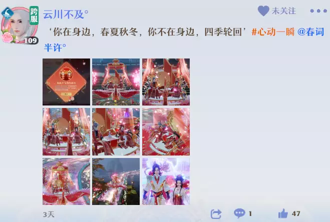他带我凤凰于飞的时候虽然因为新手没有认识多少人,宾客不多,但两个人都很开心,他还细心地截图发了仙闻附文情缘日期和“唯你”,他总能做些什么戳中我的心巴,他游戏拍照很好看,现实拍照也好看。