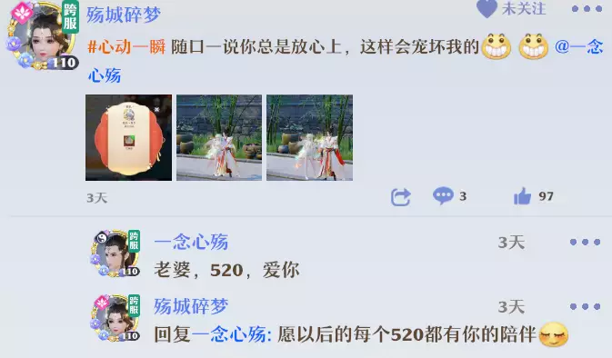 道友们,今天的节目在这里就要结束啦!在【评论区】和小梦分享你的520,让小梦也和道友们一同甜蜜一下~小梦会从中选出2名道友送上随机周边~