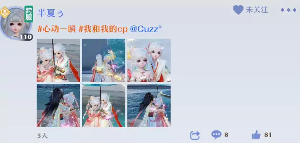 建号一个月左右后,也是我帮派和世界发cpdd被他看到了……经历了点小小的插曲(他吃醋的样子真的特别可爱,其实我也想让他看到我发的cpdd然后来找我)我们成了情缘。