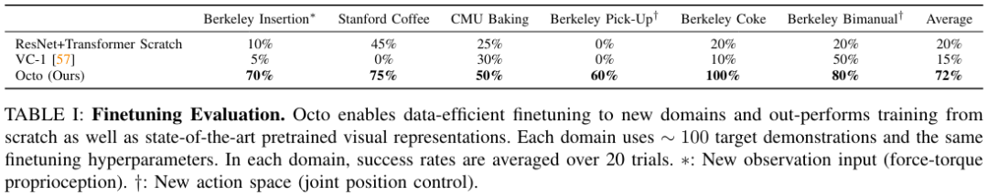 并且不得不提的是:针对所有这些评估任务,微调 Octo 时使用的配方和超参数全都一样,由此可见该团队找到了一个非常好的默认配置。