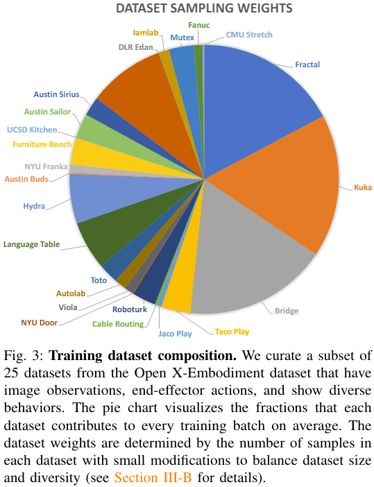 该团队从 Open X-Embodiment 中取用了包含 25 个数据集的混合数据集。图 3 给出了数据集的组成。