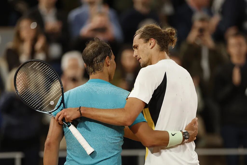 △5月27日,2024法网男单首轮,兹维列夫和纳达尔拥抱。