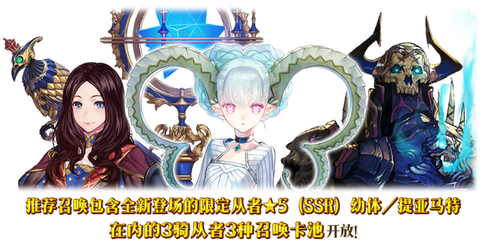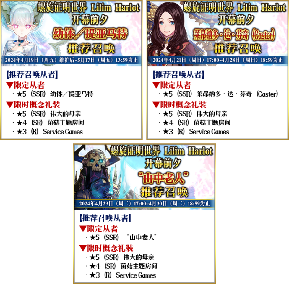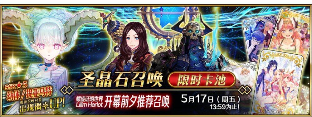 作为「螺旋证明世界 Lilim Harlot」开幕前夕纪念,推荐召唤包含全新登场的限定从者「★5(SSR)幼体/提亚马特」在内的3骑从者和3种限时概念礼装的3种召唤卡池开放!