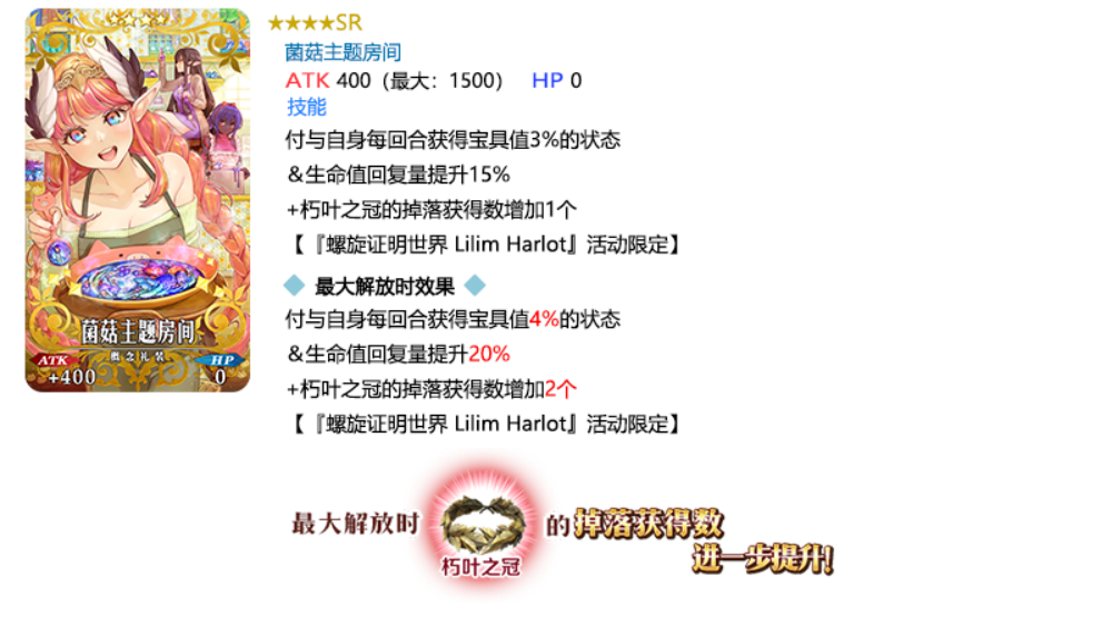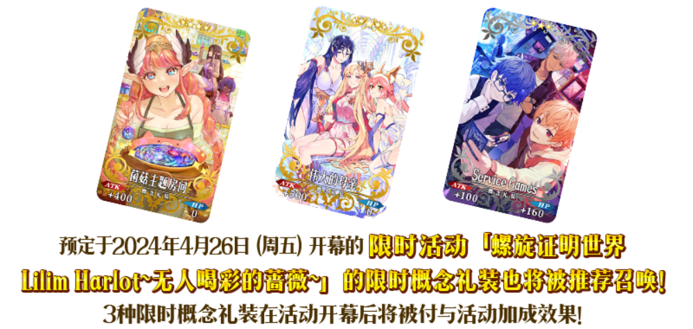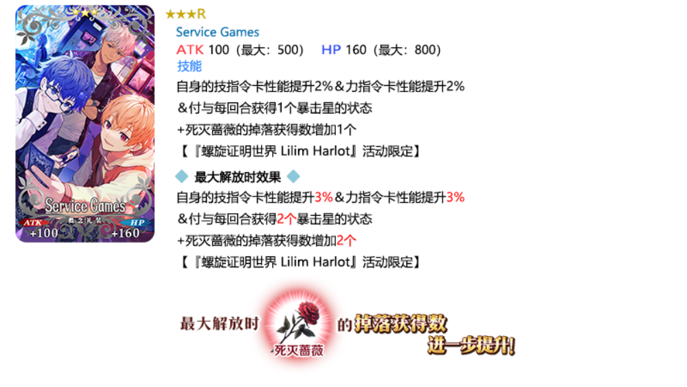 装备推荐召唤对象的3种限时概念礼装,在限时活动「螺旋证明世界 Lilim Harlot ~无人喝彩的蔷薇~」中活动道具的掉落获得数将提升!