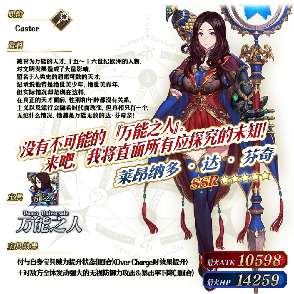 ※以上的「★5(SSR)莱昂纳多·达·芬奇(Caster)」的立绘为灵基再临第2阶段。
